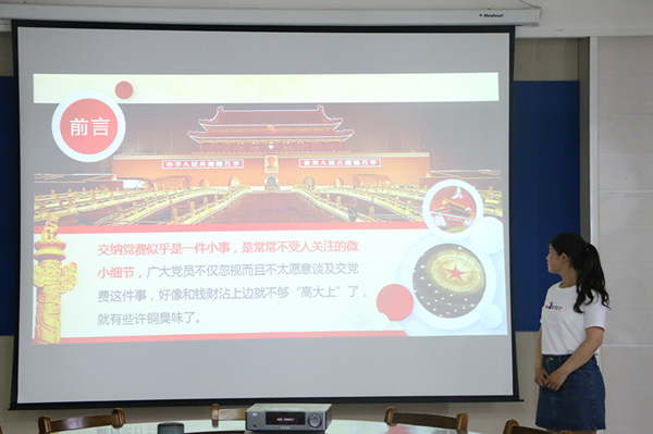 毕业生党员宋元程从“交党费这件事”谈起,向大家阐述交纳党费的重要意义以及老员工党员肩负的责任。