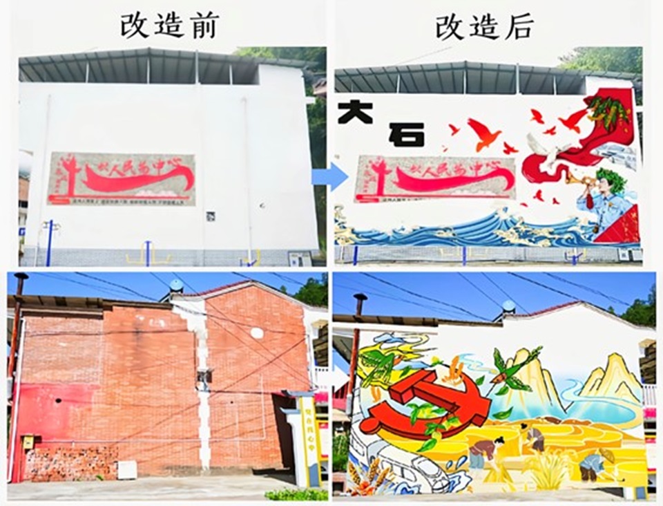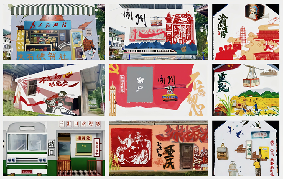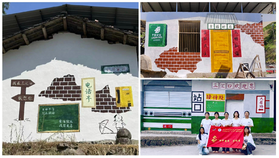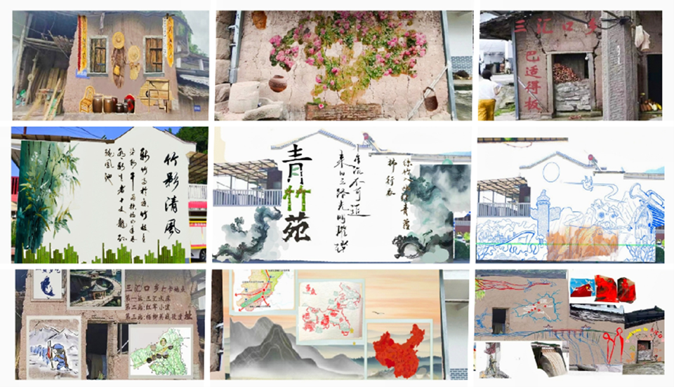 实践期间,实践团着眼于人居环境改善和乡村旅游需求,以“创品牌,成精品”为思路,以网红打卡点,标志性景点为核心,点面结合,累计完成了5个版本,共计20000余平方米的墙绘设计,1套su建模,并绘制了三面共计200余平方米墙绘。在实践过程中,团队结合当地建议以及墙面具体情况进行实时调整,使画面整体搭配更加简洁、协调,画面分割,点线面构成,视觉平衡,元素排布力求尽善尽美,把三汇口乡的风采充分展现出来。在进行墙绘的过程中还有不少村民驻足观看,并且对墙绘效果表示肯定。墙绘的结果虽然只是“简单”的几幅画,但几幅画可以迸发出巨大的力量,让三汇口乡的景色和文化传播的更深、更远,才是其意义所在。