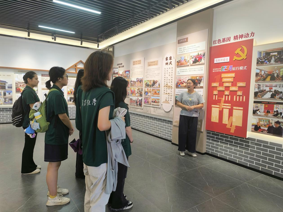 队员们沿着景观步道参观了健身区、文化长廊、儿童乐园和生态湿地。村委工作人员介绍,公园由昔日的闲置地块改造而成,既满足了村民休闲娱乐需求,又成为展示村史文化的窗口。在文化长廊,团队成员通过老照片、实物展品了解了东毛家庄村的发展变迁;在生态湿地,观察到通过水生植物净化水质的治理成果,直观感受到乡村在人居环境整治、公共服务提升方面的显著变化,深刻体会到“共建共治共享”的乡村治理理念。