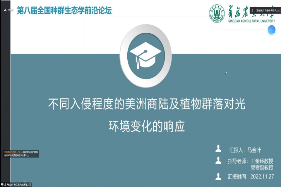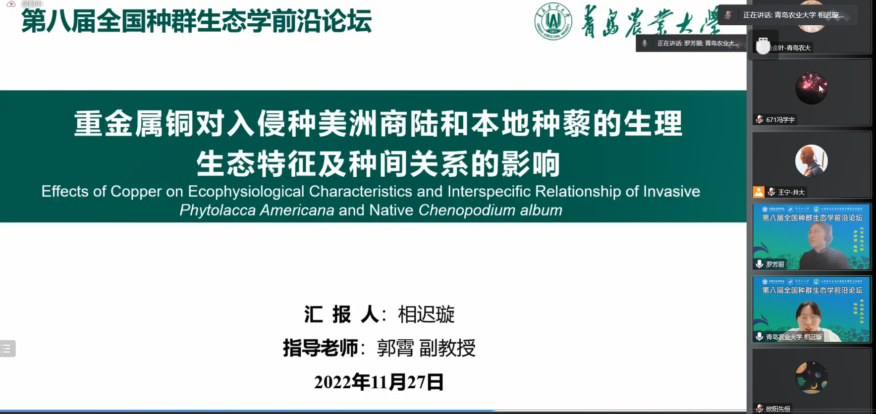 由ladbrokes立博王奎玲教授和郭霄副教授指导的研究生马金叶参加论坛并作题为《不同入侵程度的美洲商陆及植物群落对光环境变化的响应》的口头报告;郭霄副教授指导的研究生相迟璇作题为《重金属铜对入侵种美洲商陆和本地种藜的生理生态特征及种间关系的影响》的口头报告。经会务组评选,两位同学均荣获“第八届全国种群生态学前沿论坛”青年报告奖二等奖。