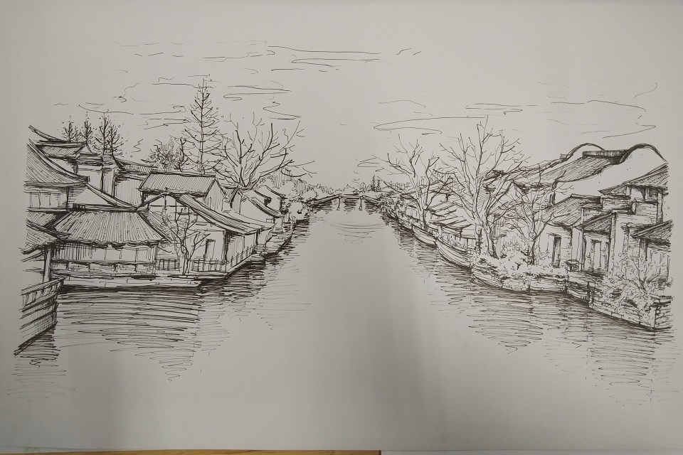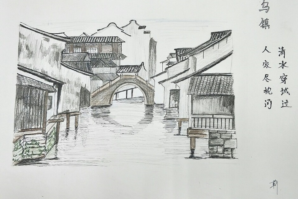 作品《乌镇》中的楼台一高一平、一窄一阔形成了鲜明的对比,将乌镇的一隅刻画的淋漓尽致。