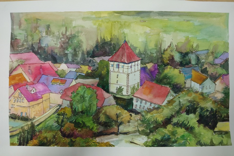 比赛现场,经过三个多小时的构思创作,同学们通过水彩渲染、马克笔快速表现、钢笔画写生等多种形式在白纸上勾画出了自己对“美丽乡村”的理解。