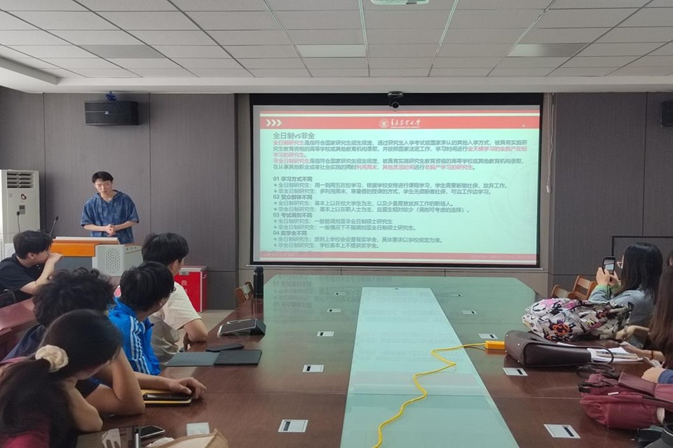 交流会上,孙梦琦以个人如何通过合理规划考研展开,分享了怎样根据自身情况做出最优选择,包括调整生活节奏和合理分配时间等方法;张嘉抡强调认真学习招生单位的调剂要求以及做好心理预期、掌握信息差的重要性;朱梓墨从多角度介绍如何利用资源进行院校筛选和专业研究,并推荐优质实用的学习资源渠道,帮助考研同学提高上岸成功率;纪艺分享了考公的全面备考策略,强调实时获取信息的重要性,在应试过程中采取针对性调整措施;徐为锋重点介绍了公务员考试中的面试环节。在交流问答环节,员工代表详细解答了同学们提出的问题,鼓励他们尽早明确学习目标,做好备考安排。