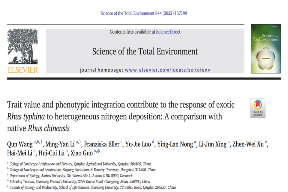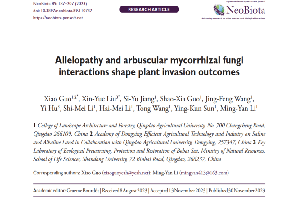 相关研究成果陆续发表在Science of the Total Environment(2022,中科院1区TOP)、Ecotoxicology and Environmental Safety(2023,中科院2区TOP)、Plant and Soil(2022,中科院2区TOP)、Frontiers in Plant Science(2023,中科院2区TOP)、Neobiota(2023,中科院2区)、Frontiers in Ecology and Evolution(2023,中科院2区)等著名生态学期刊上,累计影响因子近40。以上研究获得了国家自然科学基金及黄三角国家农高区科技专项“黄河三角洲盐碱地生态林业多维度高效利用技术创新”的资助。