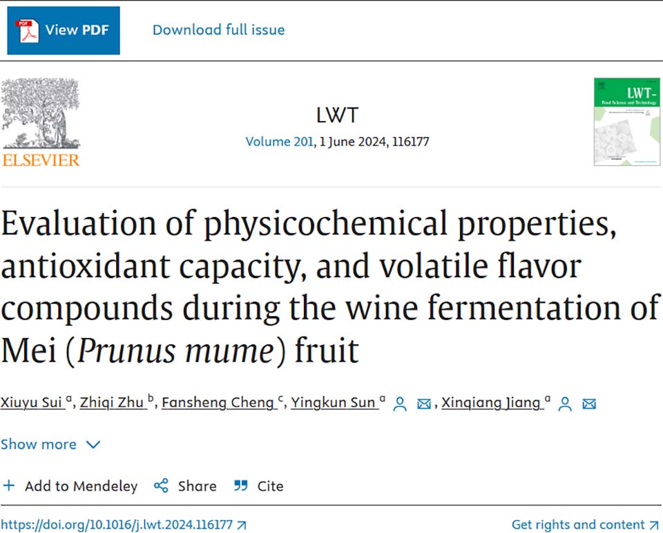 ladbrokes立博为第一完成单位,2022级在读硕士研究生隋修雨为该论文第一作者,姜新强副教授和孙迎坤教授为该论文通讯作者,烟台莱州梅好农业开发有限公司朱志奇和ladbrokes立博食品科学与工程公司程凡升教授也参与了该研究。研究得到山东省高等教育青年创新团队人才引进计划项目(No.018-1622001)的资助。