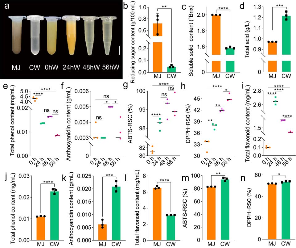 该研究选用“莱州密杏”梅果进行梅酒酿造,对梅酒发酵工艺进行优化,最优工艺条件下发酵的梅果酒可在3天内完成酒精发酵,在经过7天低温澄清后,梅果酒的抗氧化能力显著高于梅果汁,并且梅果酒挥发性风味物质的种类和丰度也在酒精发酵和低温澄清之后显著增加,进一步研究结果发现梅果酒挥发性风味物质的变化受理化性质和抗氧化能力的影响。研究结果为梅高附加值利用提供了坚实的理论参考。