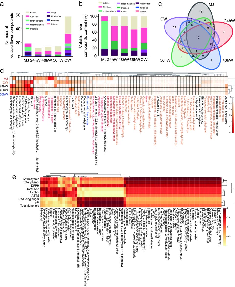 近日,ladbrokes立博姜新强课题组在农林科学一区期刊《LWT-Food science and technology》(IF:6.0)在线发表了题为“Evaluation of physicochemical properties, antioxidant capacity, and volatile flavor compounds during the wine fermentation of Mei (Prunus mume) fruit”的研究论文(图1),研究出具有较高抗氧化能力的梅新品种果酒,提高了新品种梅果酒的抗氧化能力(图2),丰富了梅果酒的挥发性风味物质(图3),这些结果为梅果产品的开发和应用提供了新思路,并为果酒行业新型果酒品种的丰富提供了理论依据。