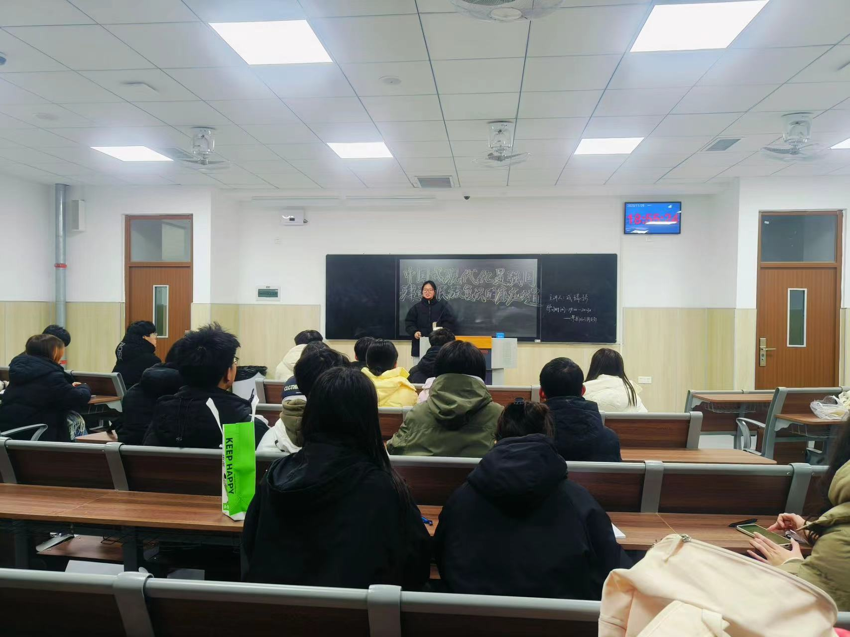 本次政治理论学习按照“中国式现代化的内涵与特征”、“中国式现代化的优势”以及“中国式现代化青年的担当”三个部分展开讲述。会上,各班团支部书记列举改革开放以来中国在扶贫减贫、改善民生、教育科技、文化创新、国际合作等方面取得的举世瞩目的成就,讲述中国式现代化新征程赋予青年人的历史使命。