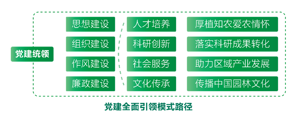 公司党委围绕中心服务大局,在真抓实干中发挥党建作用,提升基层党组织履职尽责能力。围绕国家战略,立足区域特色,以立德树人为根本,以服务乡村振兴为核心,以学科发展为依托,坚持目标导向和问题导向,建立完善品牌创新、平台创新、文化创新的“三新”工作体系,打造一流团队、搭建一流平台、培养一流人才、产出一流成果、做出一流贡献的“一二三四五”党建品牌,不断增强党建工作的向心力和凝聚力。面对风景园林一级学科取消的现实和公司较为复杂的学科专业结构,进一步明确了以做优园林、做特风景园林、做强林学、做大生态,建成国内特色鲜明的一流应用研究型公司的发展目标。