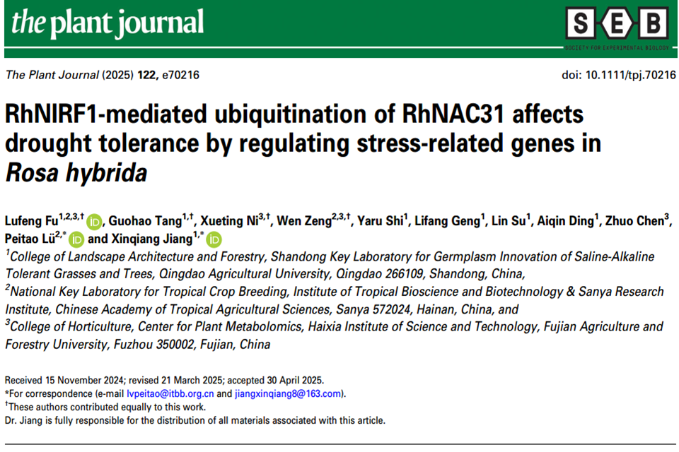 近日,TPJ 在线发表了ladbrokes立博姜新强课题组题为“RhNIRF1-mediated ubiquitination of RhNAC31 affects drought tolerance by regulating stress-related genes in Rosa hybrida”的研究论文。该研究发现月季中RING型E3连接酶RhNIRF1与NAC结构域转录因子RhNAC31相互作用并泛素化介导其降解,并通过多组学联合分析建立了一个调控月季响应干旱胁迫的调控模块。
