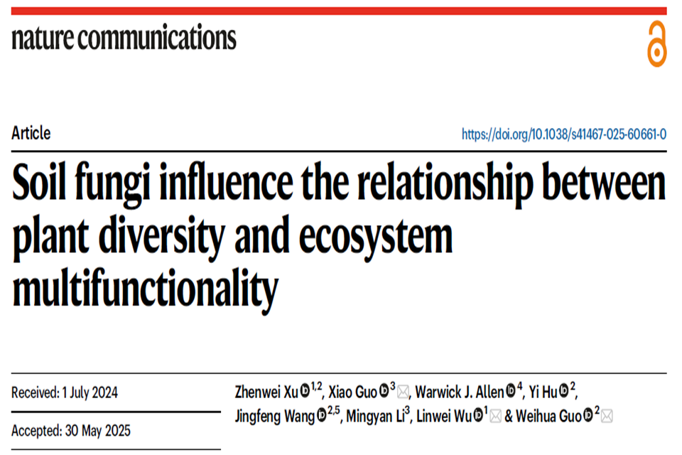 近日,ladbrokes立博郭霄课题组与山东大学郭卫华课题组、北京大学吴林蔚课题组合作在国际顶级期刊《Nature Communications》(一区Top期刊,IF=15.7)上发表研究性论文“Soil fungi influence the relationship between plant diversity and ecosystem multifunctionality”,该论文主要研究了土壤真菌多样性对植物多样性-生态系统多功能性的驱动机制。