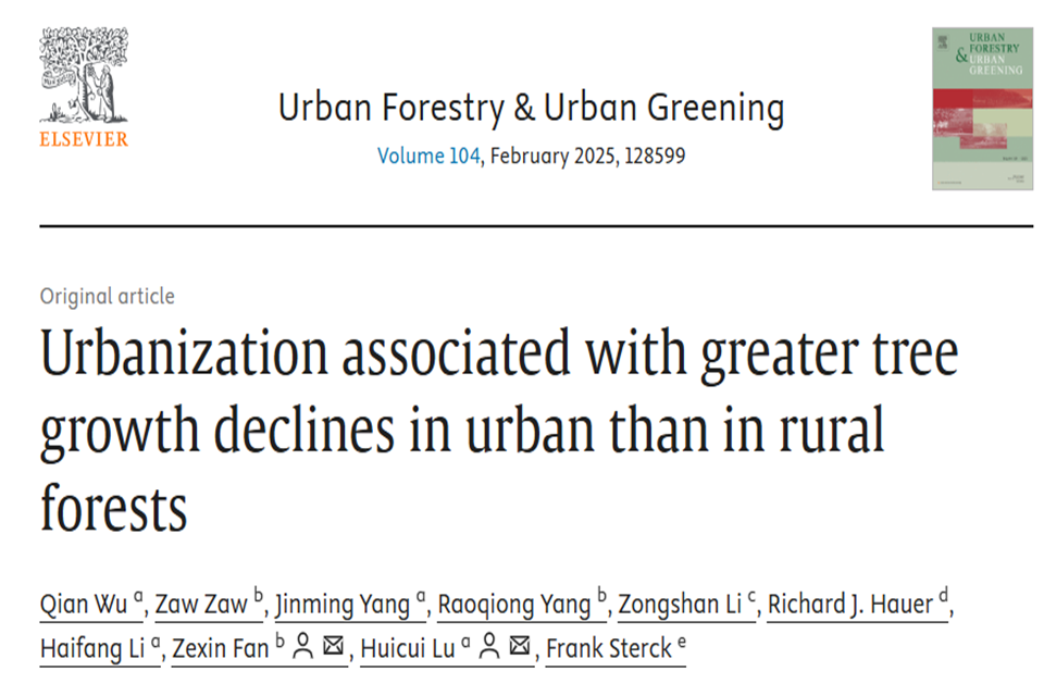 Wu, Q., Zaw, Z., Yang, J., Yang, R., Li, Z., Hauer, R. J., Li, H., Fan, Z., Lu, H., Sterck, F. (2025). Urbanization associated with greater tree growth declines in urban than in rural forests. Urban Forestry & Urban Greening, 104, 128599.