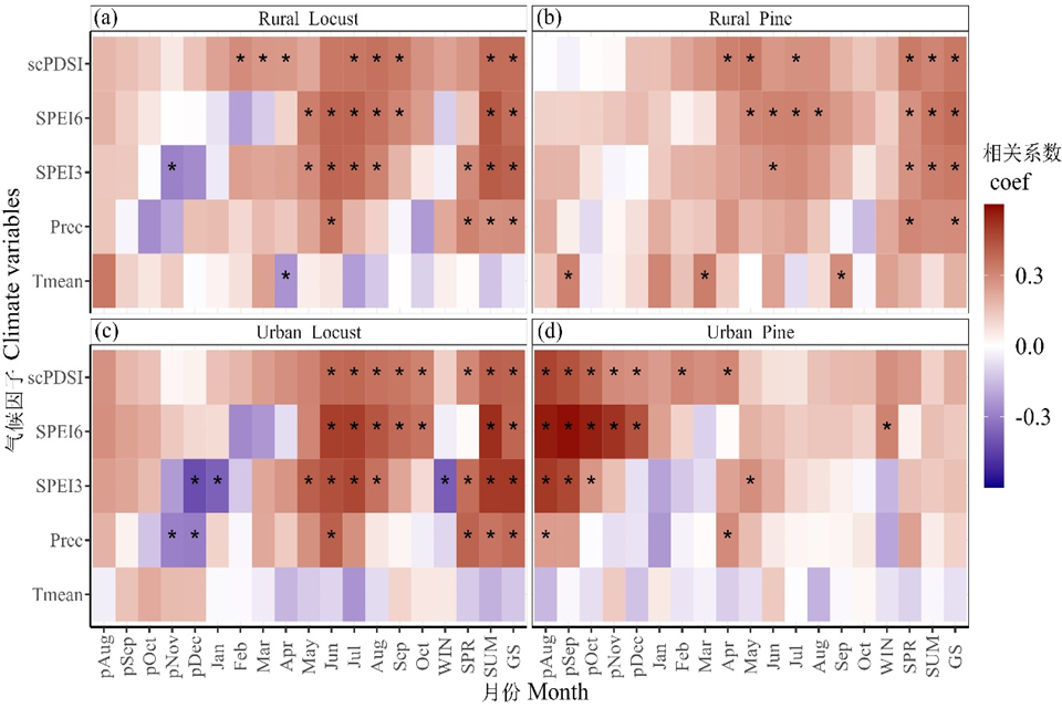 随着气温持续升高,气候变化与城市化的交互作用对树木生长的影响尚不明确。在本研究中,团队以青岛市为研究区域,该地区近年来城市化发展迅速,温度呈现明显上升趋势。研究人员选取了分布广泛、作为当地沿海防护林优势树种的城区森林公园与郊区崂山的刺槐和黑松为研究对象以探究在城市化与气候变化双重影响下典型树种的生长响应机制。