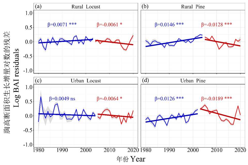 研究团队通过在2019年和2023年分别在郊区和城区设置49块(20m×30m)标准样地,从342棵树上共采集了626根树木年轮样本。年轮宽度残差年表结果显示,两地树木在生长速率和气候响应上存在显著差异:城区树木生长较慢,可能受限于更大的水分压力。具体而言,城区刺槐在当年生长季(4–9月)受水分供应限制,黑松则在前一年晚生长期(8–9月)受限(图2)。这表明不同树种对水分的需求和响应存在差异,且城区环境加剧了这种水分限制对树木生长的影响。生长趋势分析表明,自21世纪初以来,两种树种均出现显著生长趋缓,城区尤为明显(图3),反映出气候变暖与城市化加剧了干旱胁迫。研究人员认为,这可能与城区温度持续升高导致水分利用效率降低有关,预示着未来这些树种的生长可能进一步受到抑制。